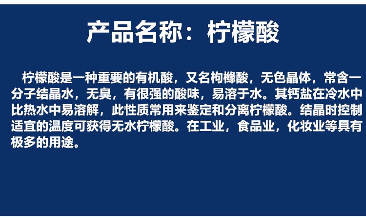 柠檬酸是世界上用生物化学方法生产的产量最大的有机酸, 柠檬酸及盐类是发酵行业的支柱产品之一,主要用于食品工业,如酸味剂、增溶剂、缓冲剂、抗氧化剂、除腥脱臭剂、风味增进剂、胶凝剂、调色剂等。