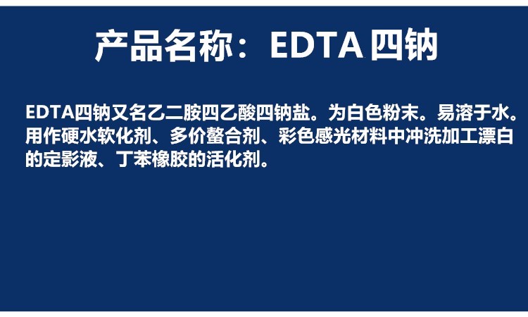 是一种重要的络合剂及金属掩蔽剂。可用于纺织行业染色,水质处理、彩色感光、医药、日用化工、造纸等行业,作为添加剂、活化剂、净水剂、金属离子遮蔽剂和丁苯橡胶工业中的活化剂。干法晴纶行业中抵销金属干扰,提高所染织物的色泽和亮度,还可用于液体洗涤剂中,提高洗涤质量,增强洗涤效果。