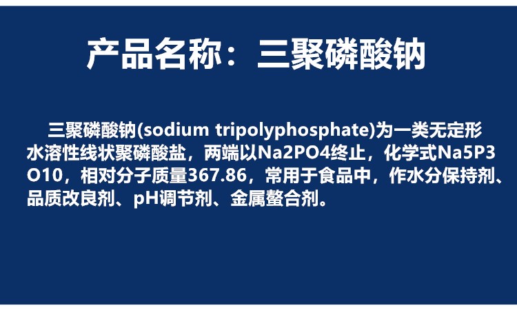 又称三磷酸钠。有无水物及六水合物两种, 是一种具有链状结构的缩合磷酸盐。